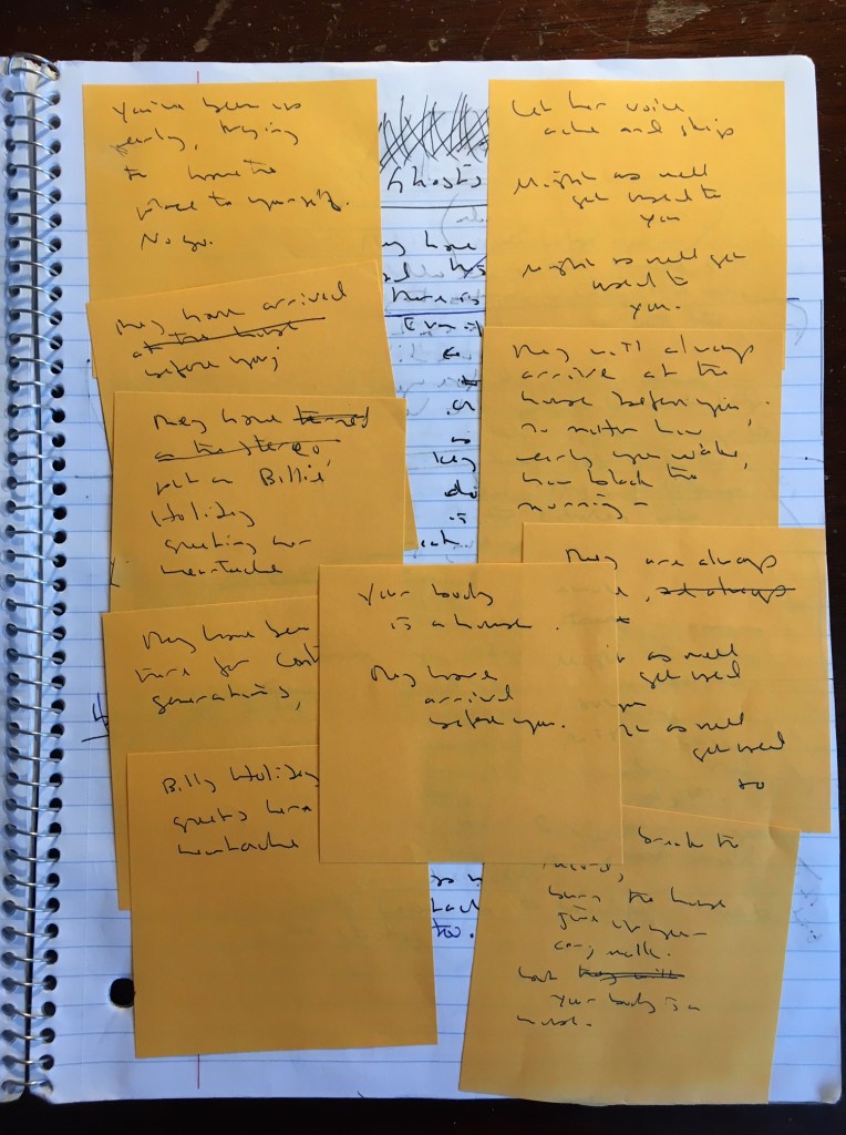 I began to write words and phrases on sticky notes. These became lines, which I arranged and rearranged in my notebook. I found I could focus on a single word, or a single line. These eventually became poems—poems, I realized, that centered on anxiety and grief. I just let the lines happen, good or bad, and in that way found myself slowly on the journey back to my book.